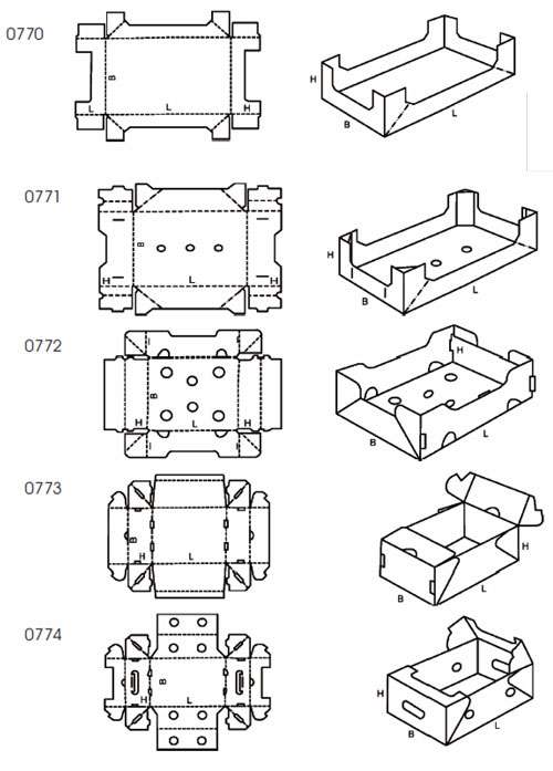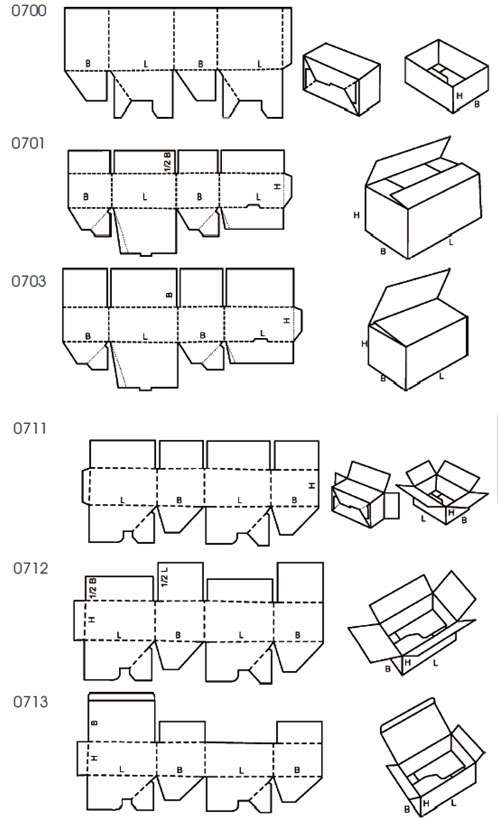 - Be specifinių kirtimo formų gaminame FEFCO 200, 201 klasikinės, 300 dugnas/dangtis, 301, 306, 310, 312, 313, 320 teleskopines, 401 kryžius, 409 paveikslams, ir kitas mažiau paplitusias kartonines dėžes.